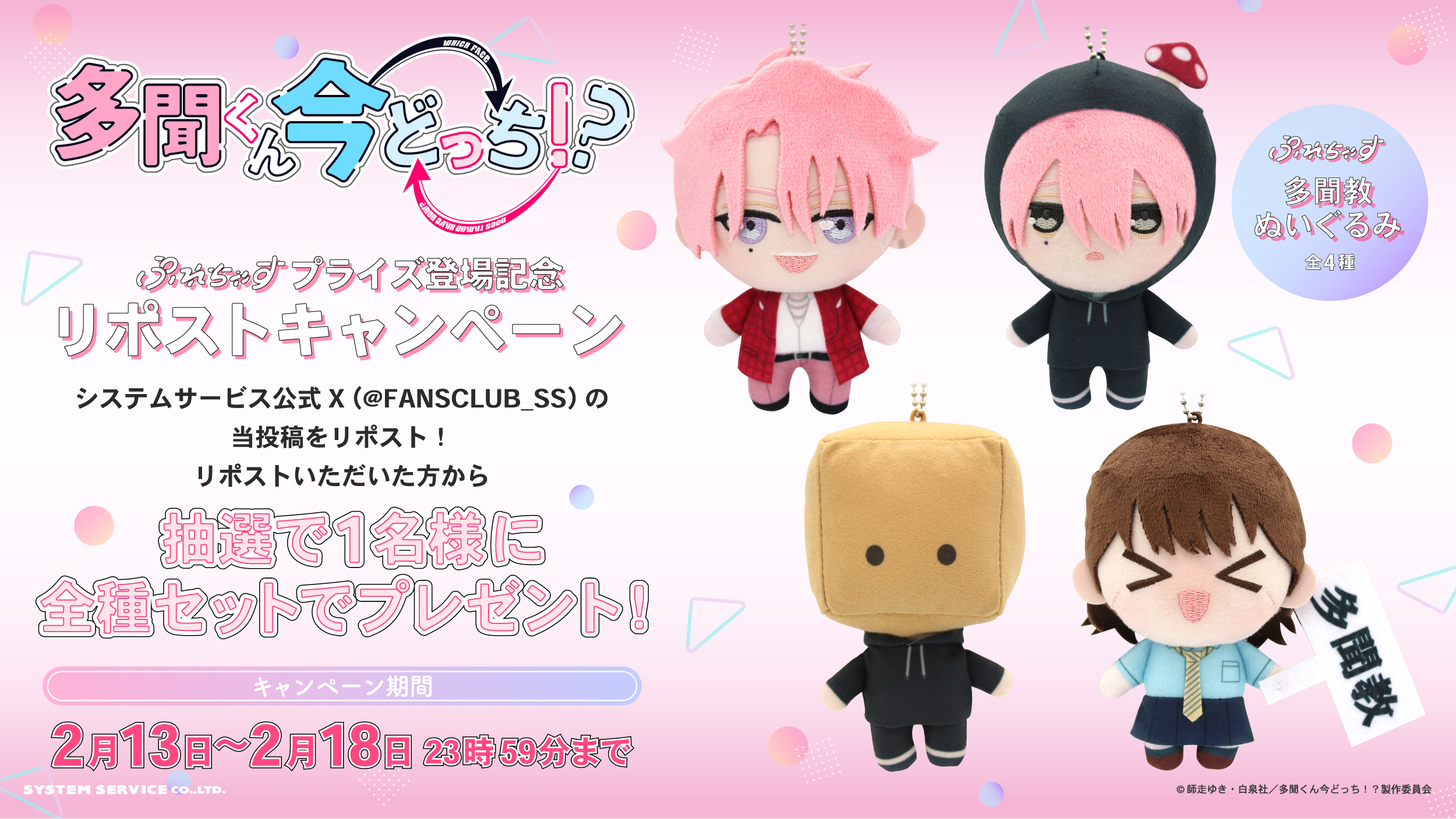 システムサービス株式会社(本社:東京都豊島区、代表取締役社長:田村宗弘)は、TVアニメ『多聞くん今どっち!?』のプライズ商品を2026年2月より順次アミューズメント施設にて展開いたします。